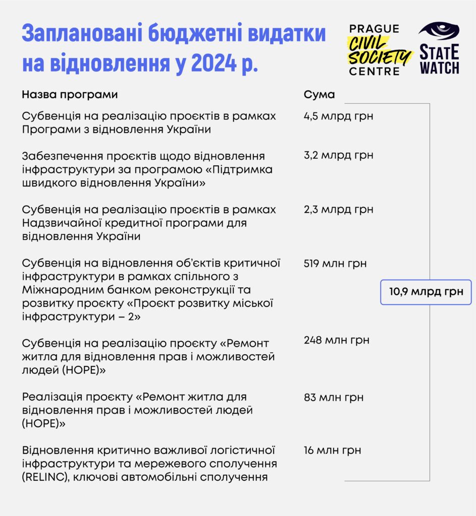 Державний бюджет України на 2024 рік передбачає 7 бюджетних програм, спрямованих на відновлення України від наслідків війни, на загальну суму 10,9 млрд грн.